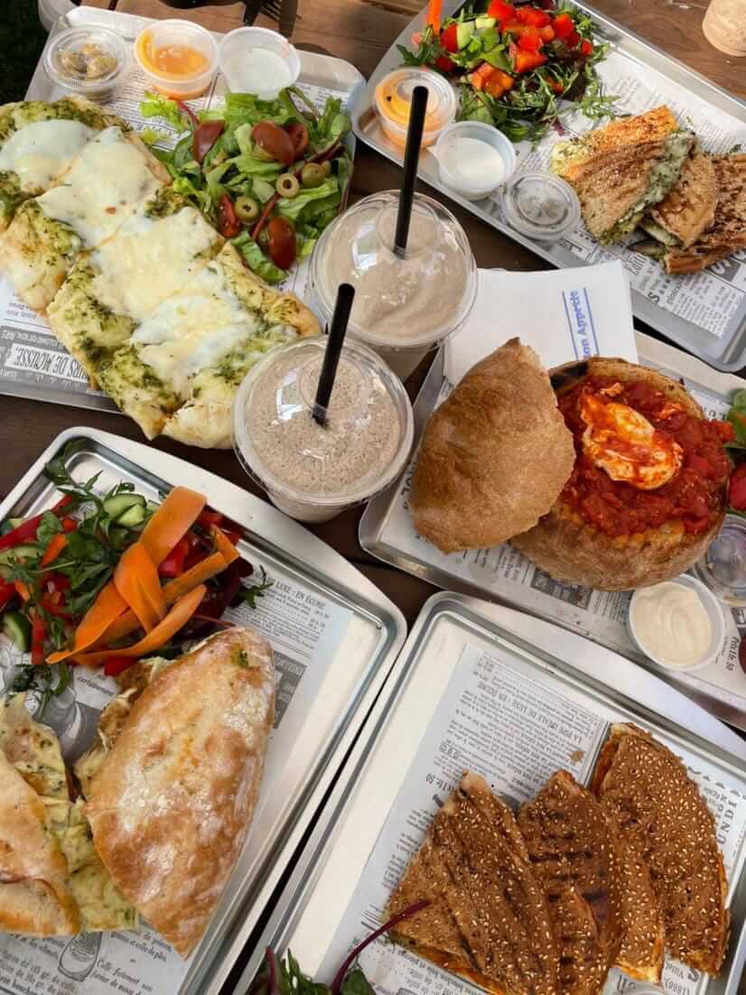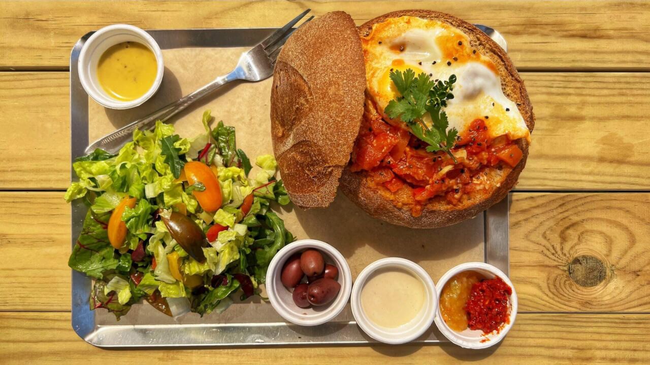 שקשוקה במחבת לוהטת עם לחם מיוחד ללא גלוטן, מגוון כריכים בלחם ללא גלוטן, מגוון טוסטים ללא גלוטן, מגוון סלטים וקישים. ולגבי מתוקים מגוון עוגות, מלבי ועוד.