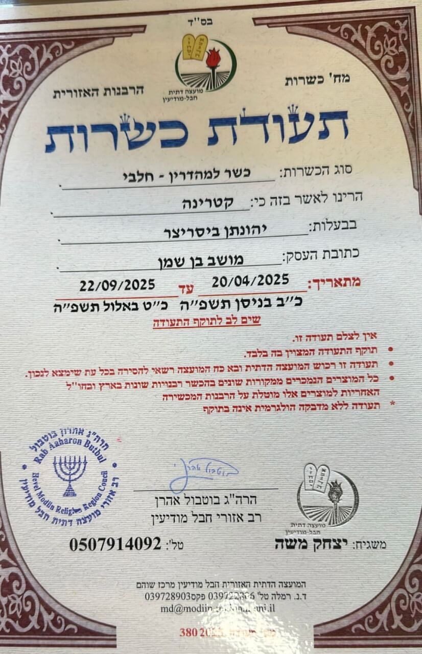 העגלה עם תעודת כשרות מהדרין של הרבנות האזורית