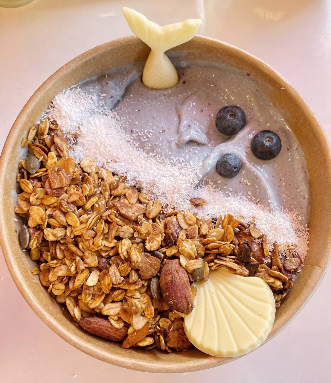 מוזלי, סלט יווני, קערות בריאות עם גרנולה כסמת, מקפא מנגו, מקרונים, עוגיות