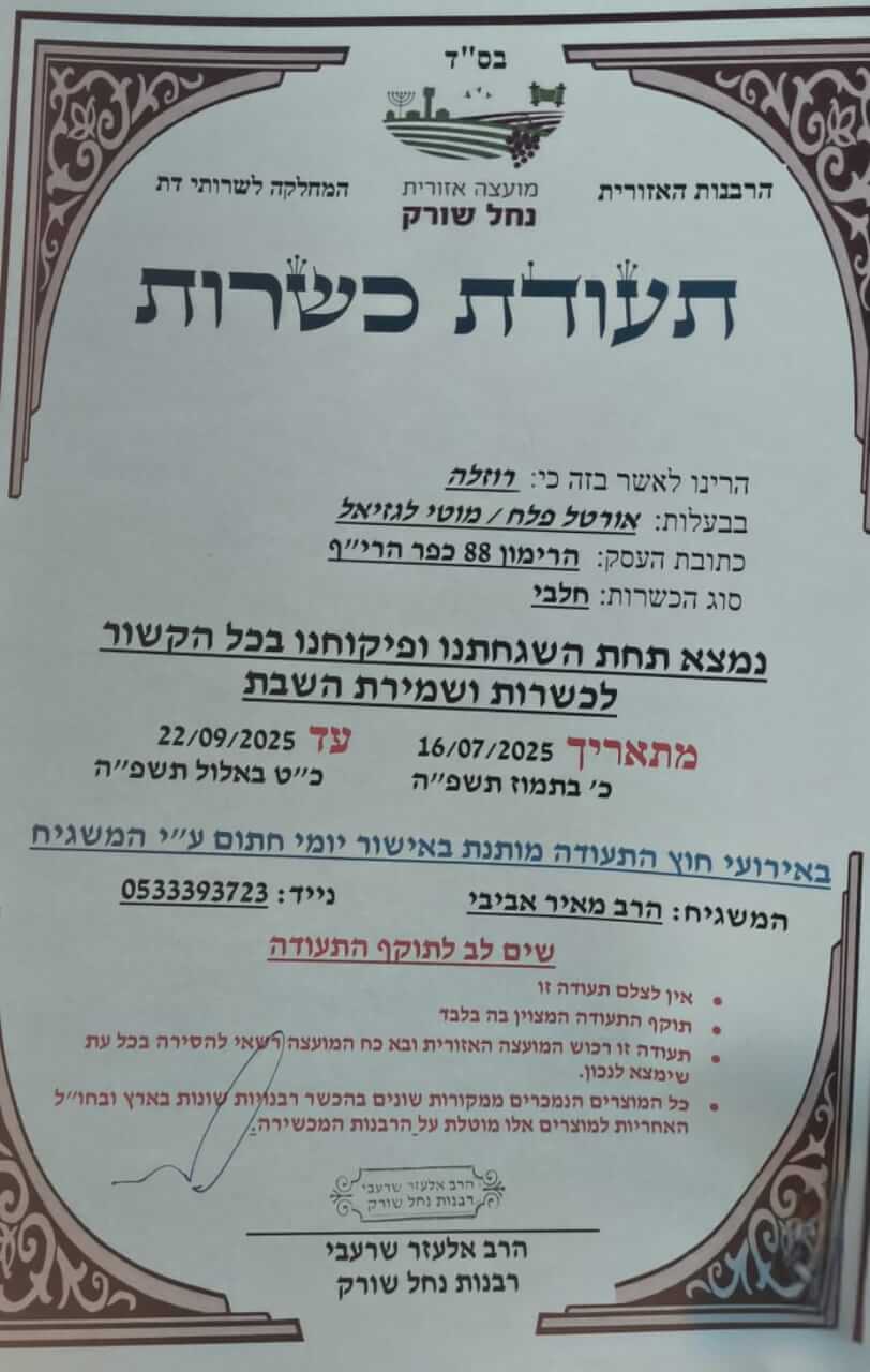 העגלה עם תעודת כשרות של הרבנות האזורית