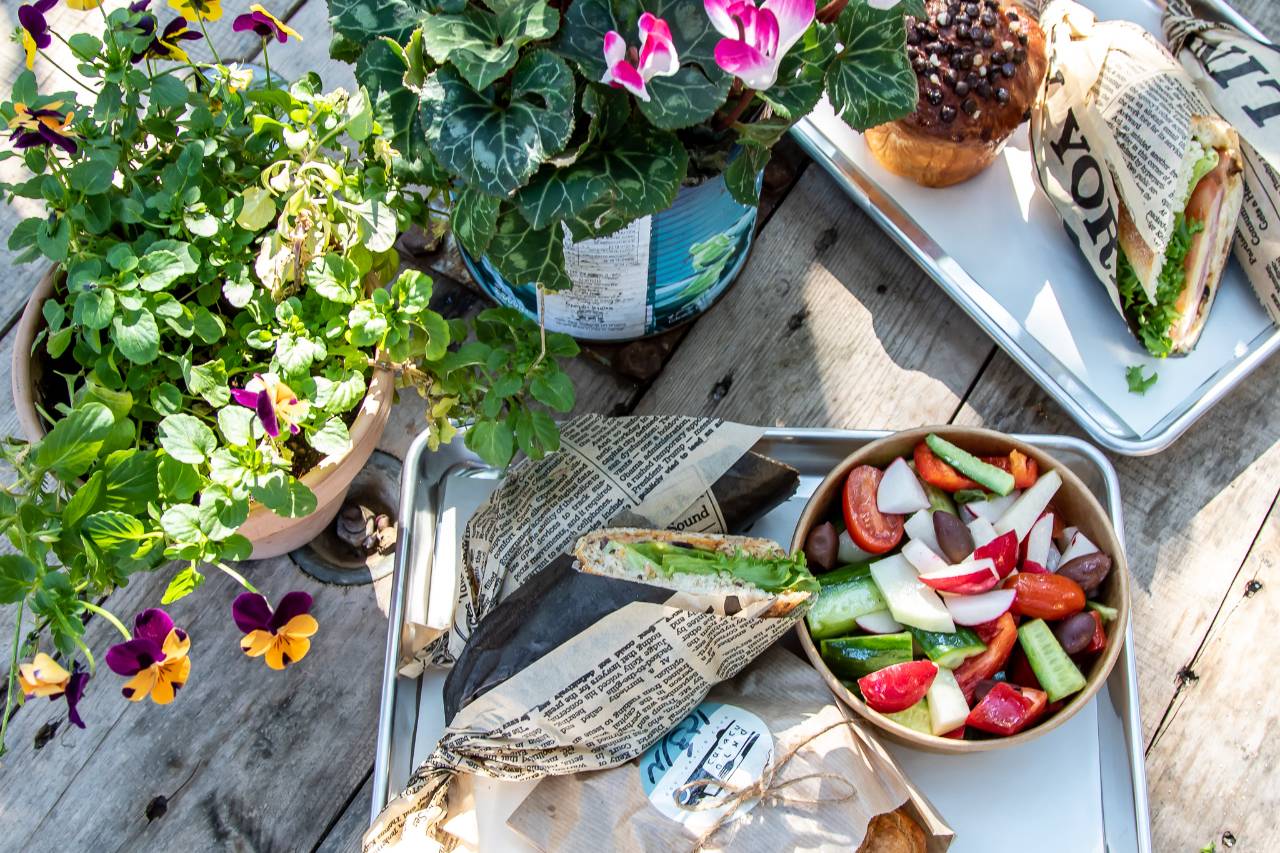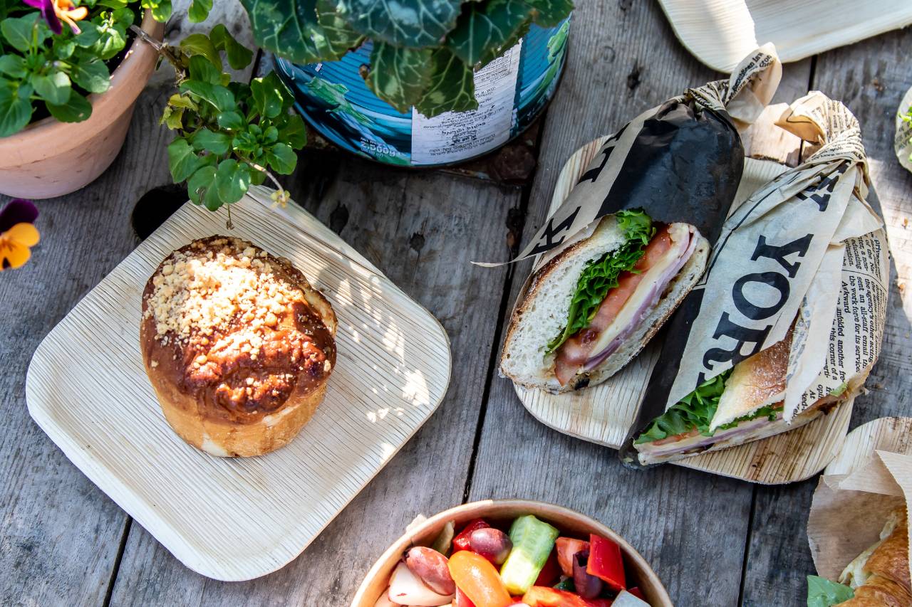 כריך קפרזה, כריך חציל שרוף ופלפל קלוי, עוגה בחושה כרמלה, סלט מוצרלה, סלט בושה וארטישוק, קערת ירקות